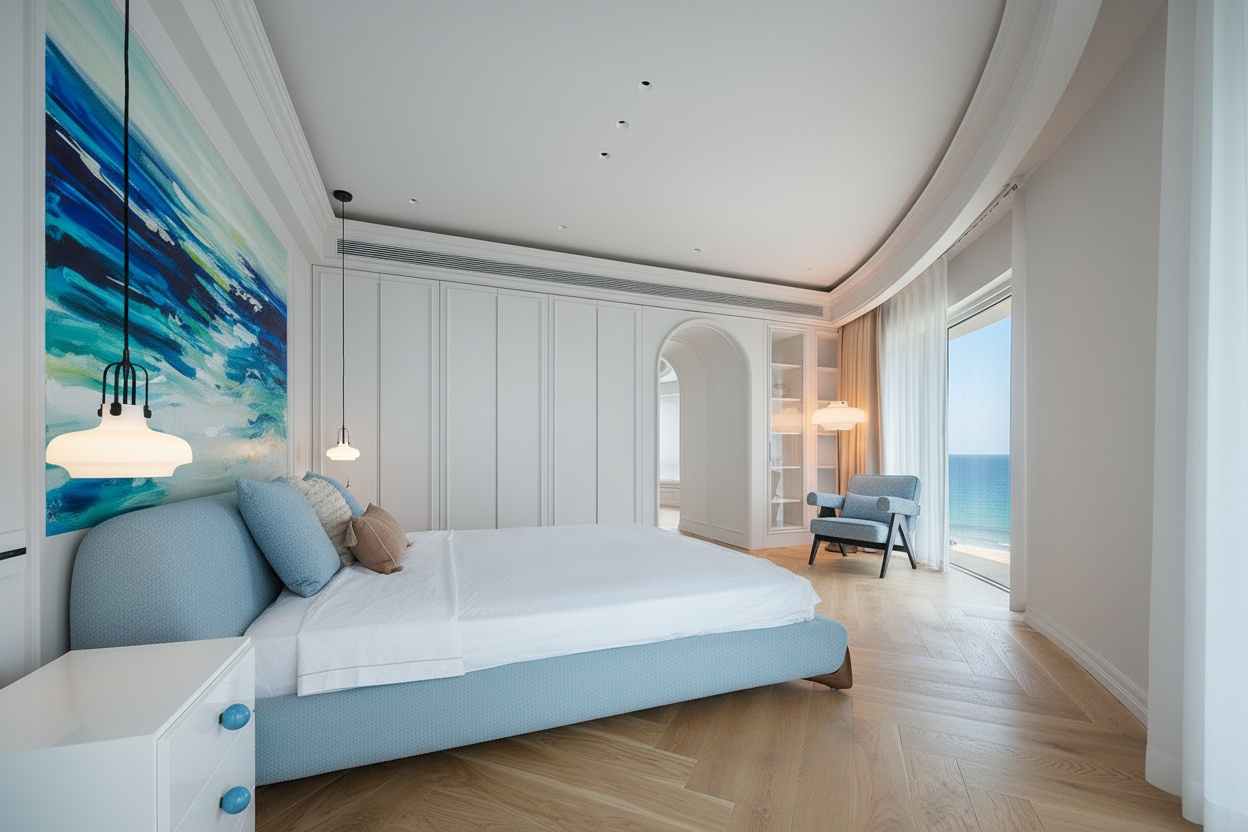 Light, breezy, and inspired by the sea. Whitewashed walls, blue accents, rattan textures, and soft linen create the perfect coastal escape feeling.