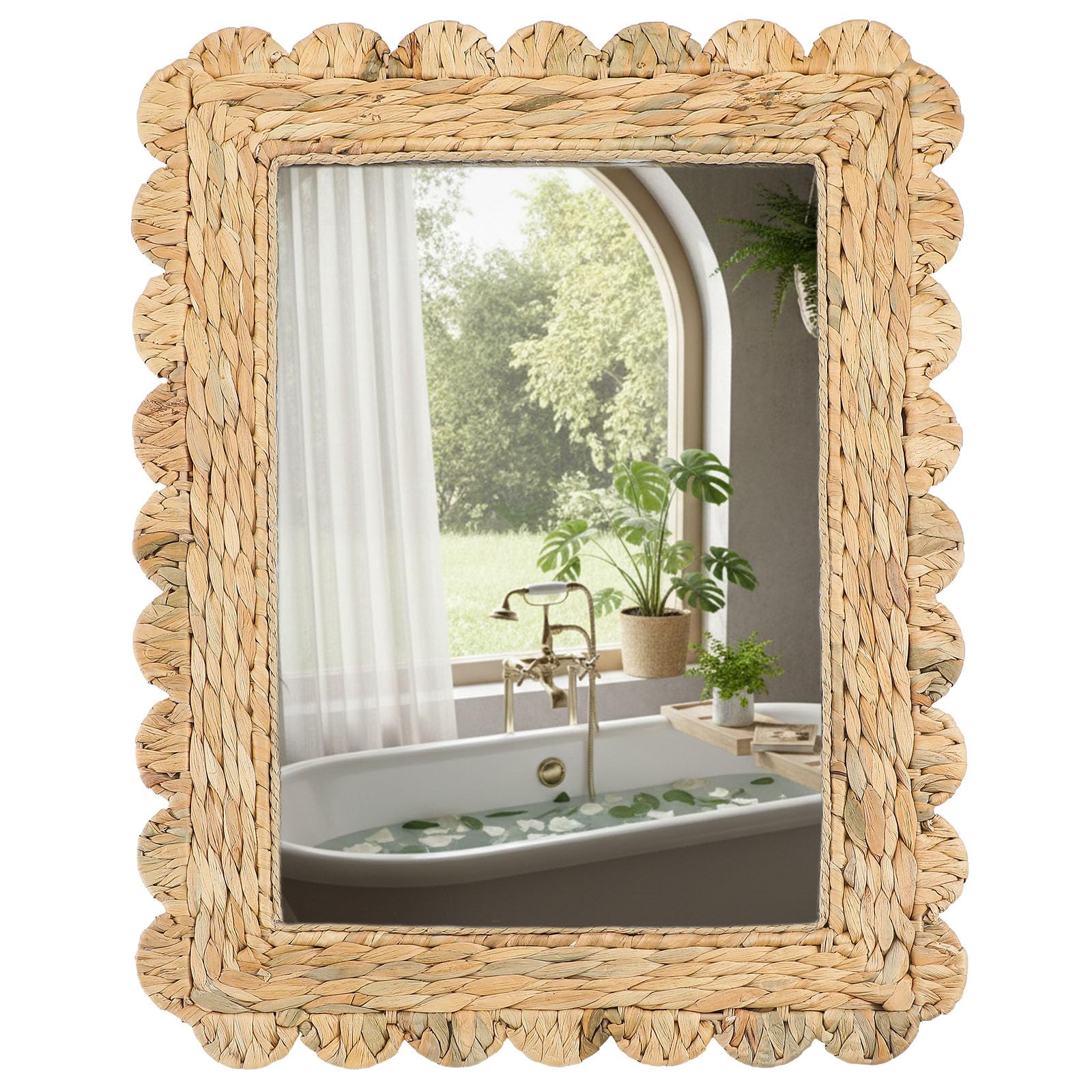 They get a distinctive scalloped mirror crafted from handwoven rattan that brings organic texture and a coastal-meets-boho vibe to a room. It works as a focal point over a console, in an entryway, or above a bathroom vanity where the natural tones soften the space. For daily use it reflects light and adds warmth, and for special occasions it creates an elegant backdrop for photos or a styled vignette.